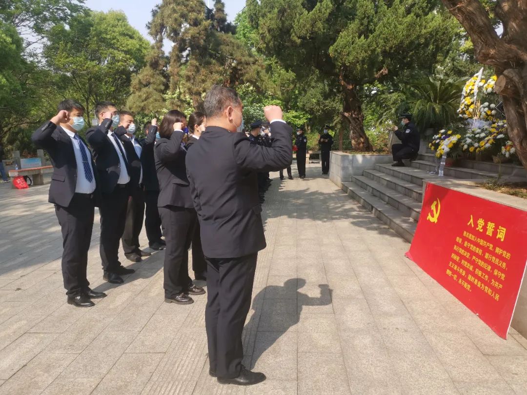 党员们怀着敬仰的心情来到施洋雕像墓碑前,2名党员代表向纪念碑敬献花篮,全场人员肃立向为共产主义事业奋斗献身的施洋烈士默哀。随后,党支部书记陈燕同志和党员干部一起认真聆听施洋烈士事迹介绍,缅怀革命先烈的丰功伟绩,深刻感受英烈威武不屈的崇高品格。最后,党支部委员帅碧同志带领全体党员干部在施洋墓碑前,进行庄严宣誓,重温入党誓词。